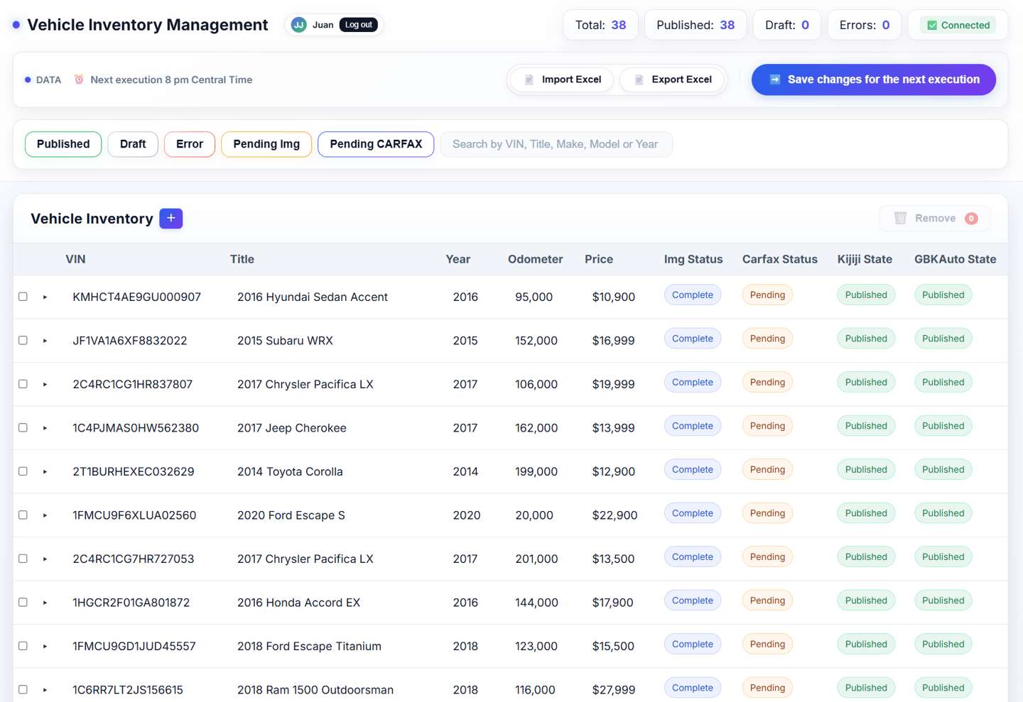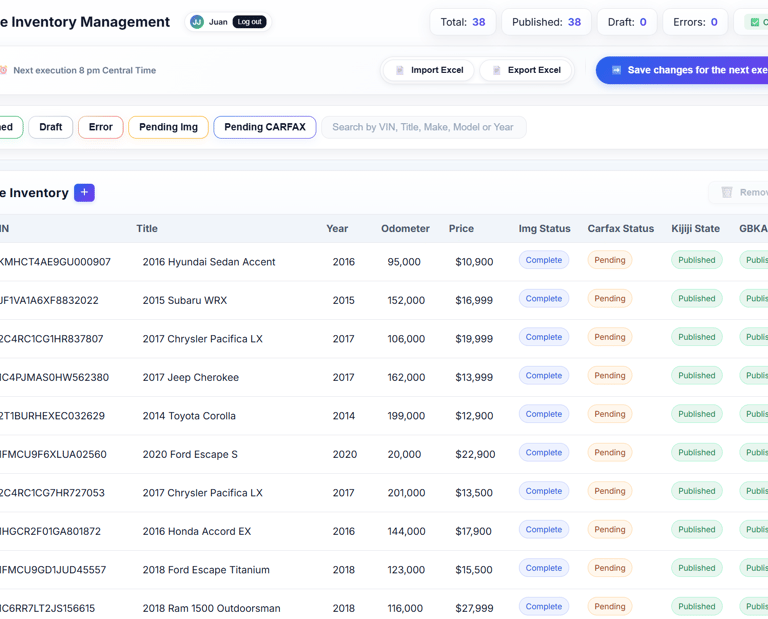 This project delivers a web app that lets Canadian auto dealers manage inventory once and publish everywhere, major marketplaces (e.g., Kijiji, AutoTrader, CarGurus, Carpages) and the dealer’s own website, without repetitive work. The platform centralizes VIN decoding, vehicle details, photos, and documents (like CARFAX), replaces spreadsheets with a clean dashboard, and pushes listings live with a simple “one-click to publish” flow. Intelligent status tracking, search and filters, and a reporting module make it easy to monitor past runs, diagnose failures, and keep channels consistent. Designed for operational efficiency, it saves hours weekly, cuts errors, and streamlines onboarding for dealership staff.